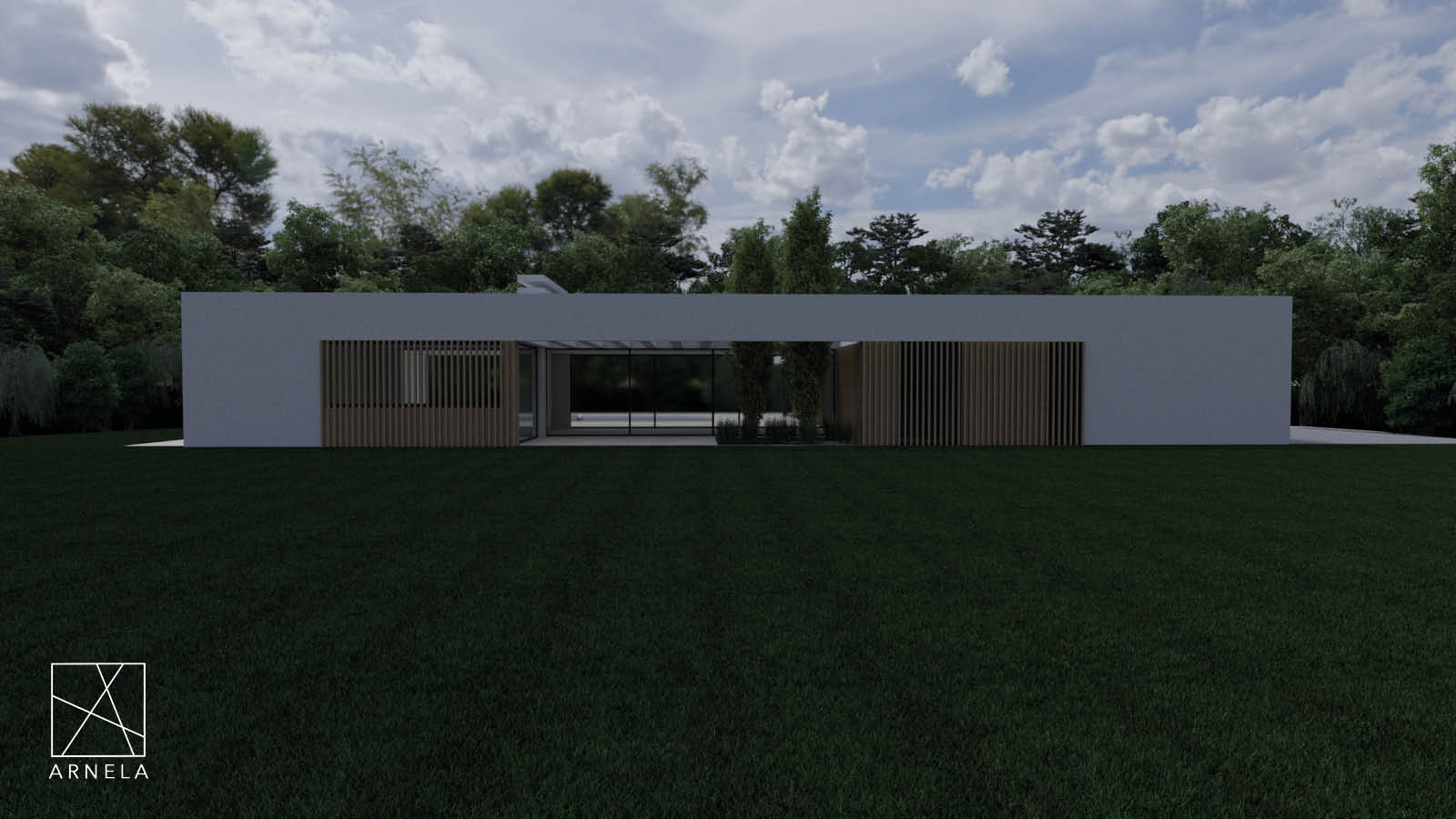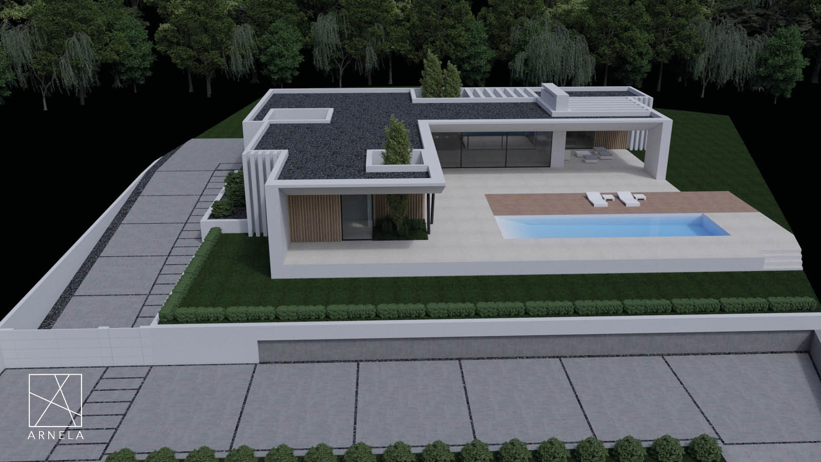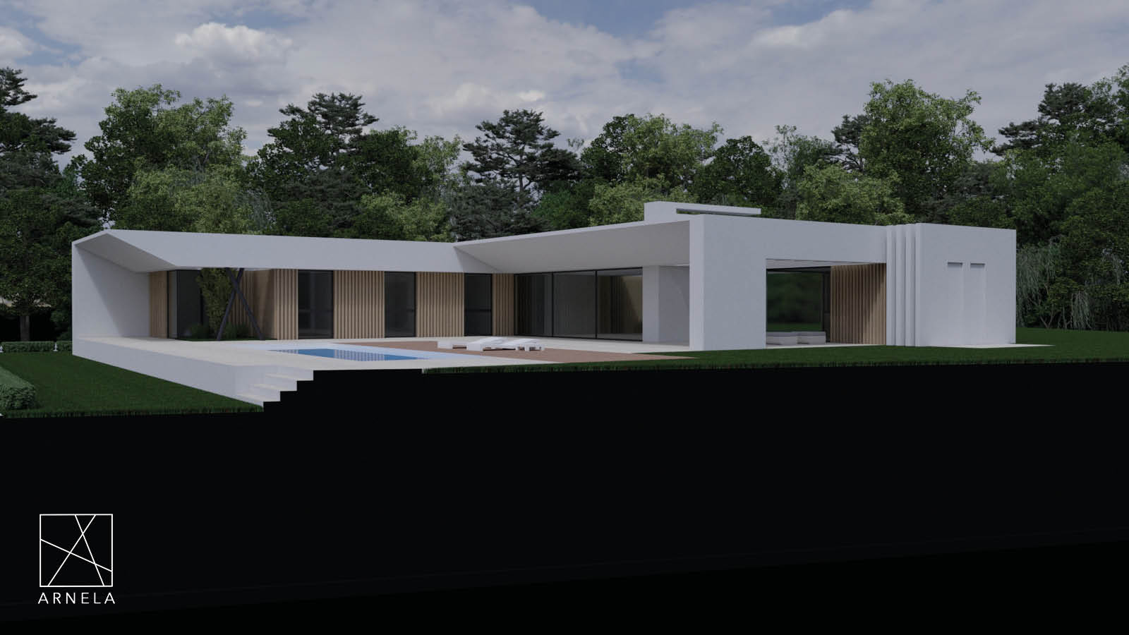 Vivienda unifamiliar aislada, ubicada en el concello de Burela cerca de la costa y la playa de A Marosa. Se proyecta una vivienda en planta baja con un desarrollo en forma de L que abraza la zona de piscina.Esta casa se divide en varias zonas diferenciadas, el hall de entrada distribuye el espacio por todos sus lados, en uno de ellos encontramos el garaje y trasteros, por otro el salón- comedir y cocina, por otro el acceso a la piscina y por otro lado tenemos acceso a la zona de dormitorios. Además, cuenta con una zona de estar exterior y zona de barbacoa y merendero cubierto.