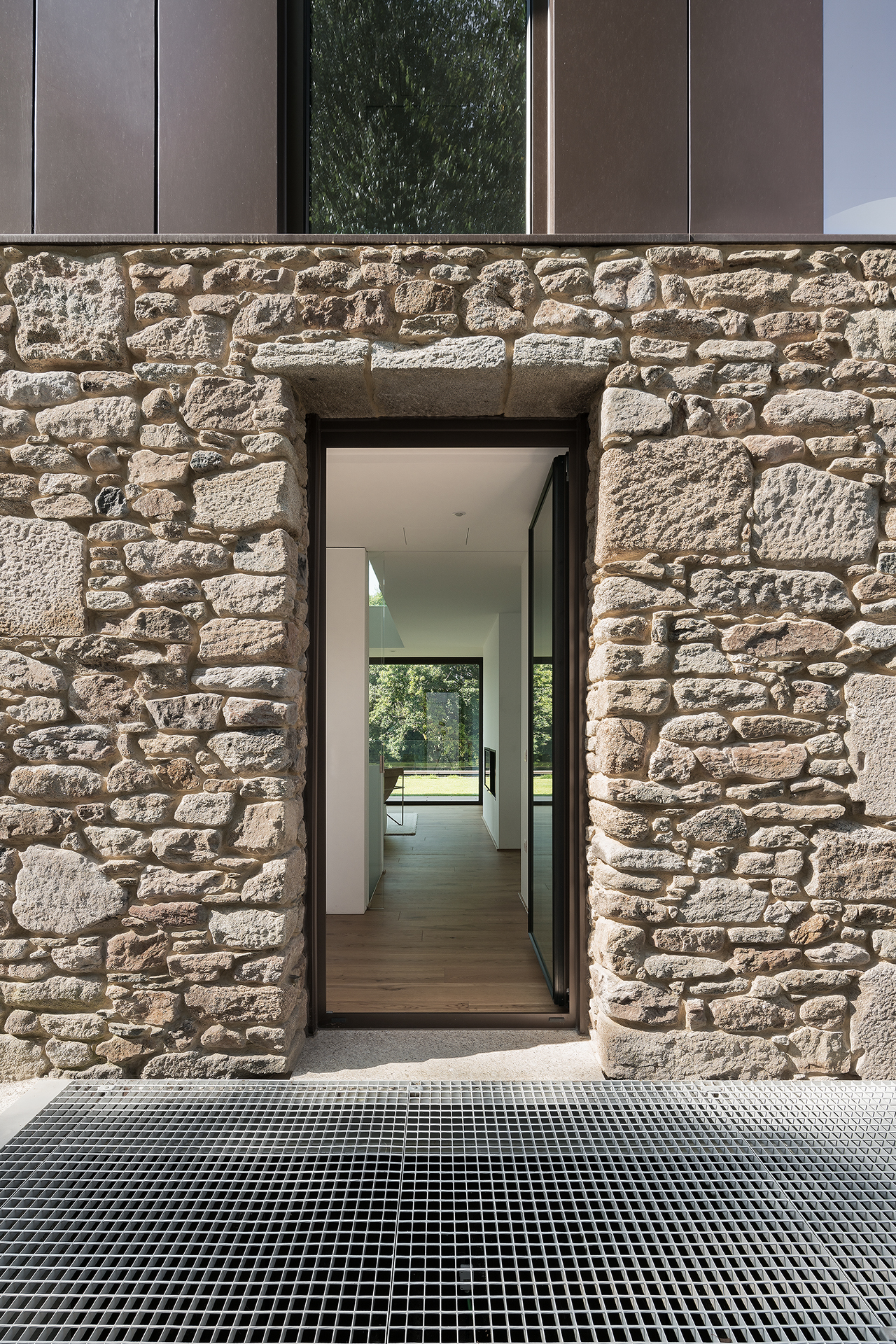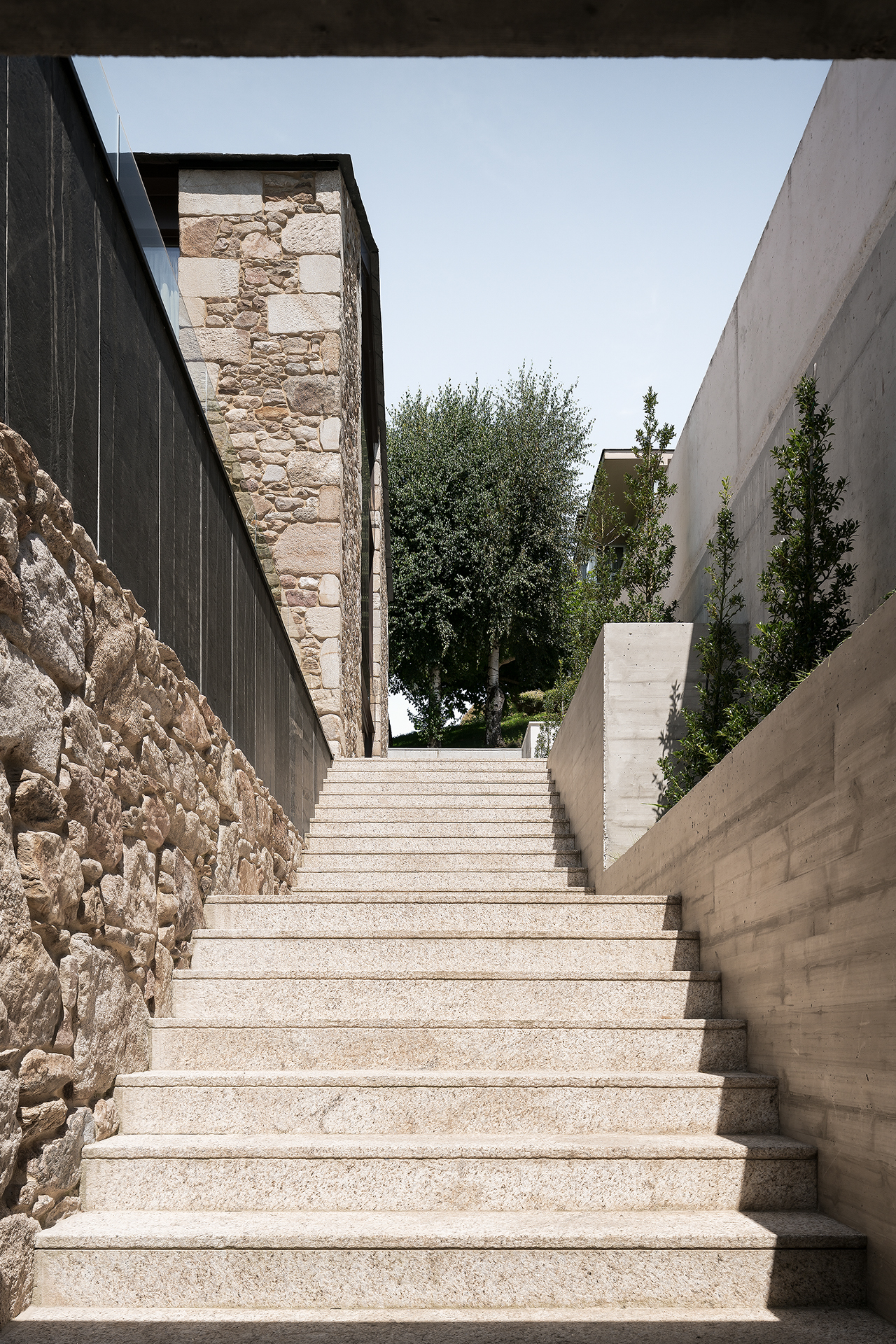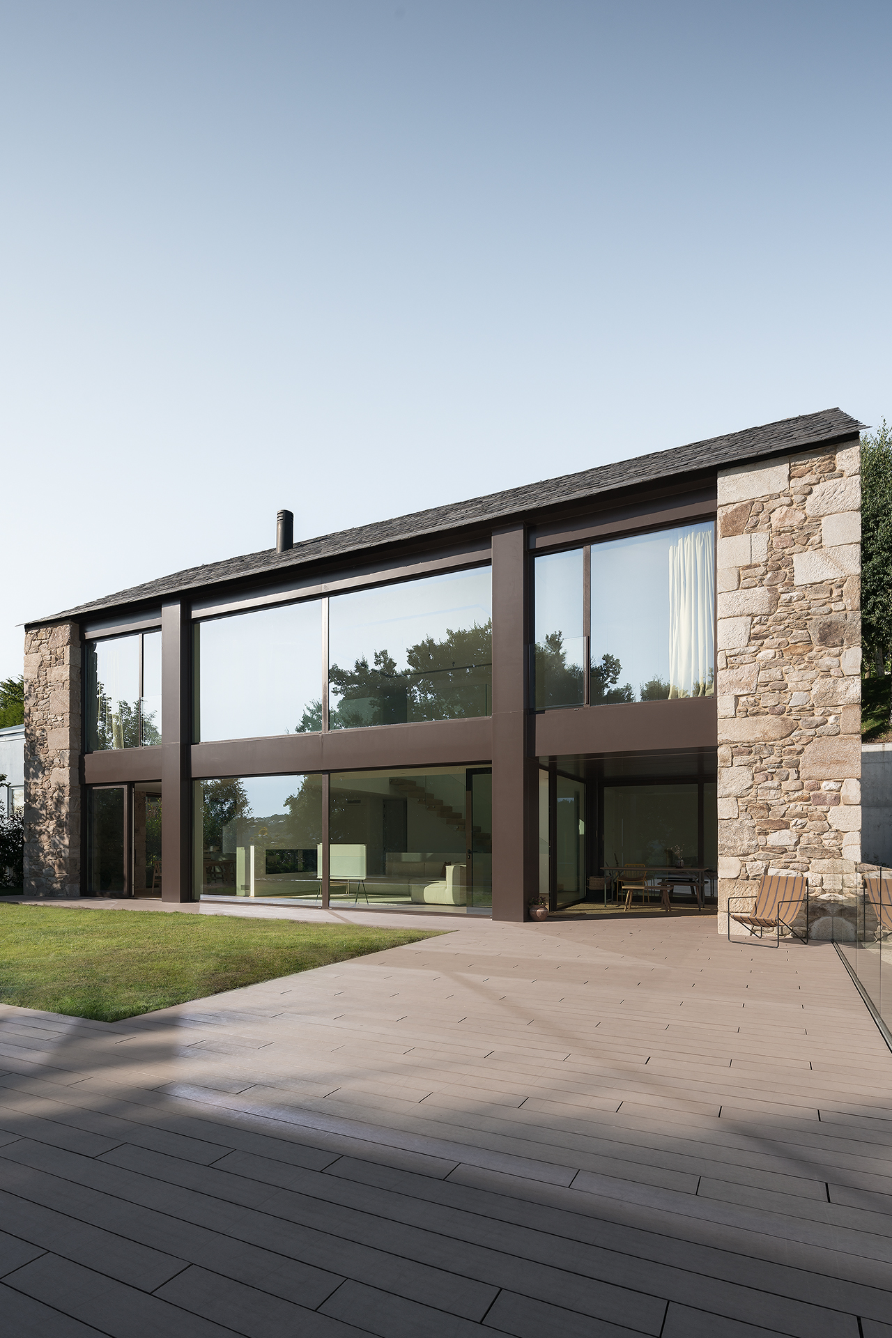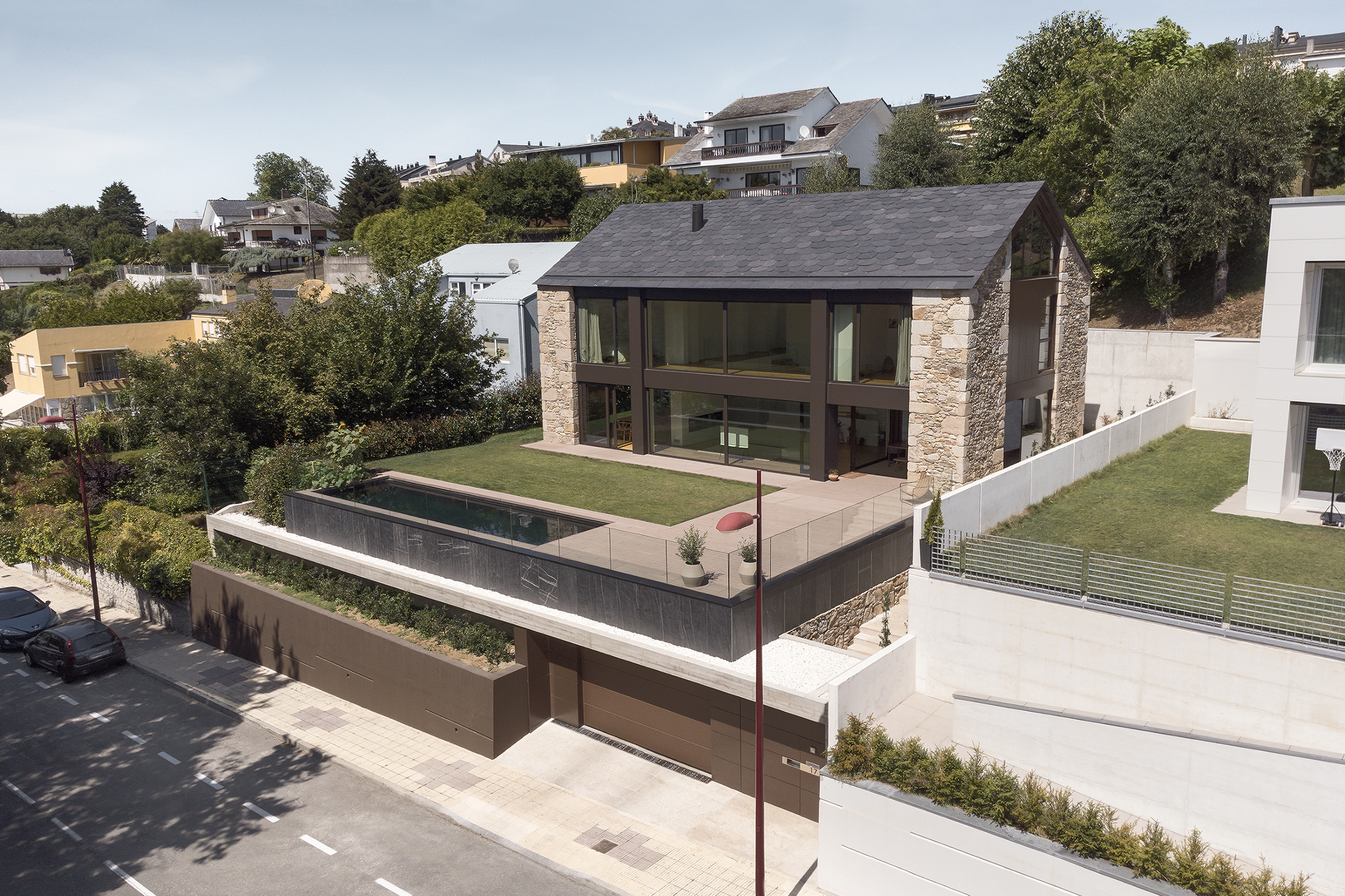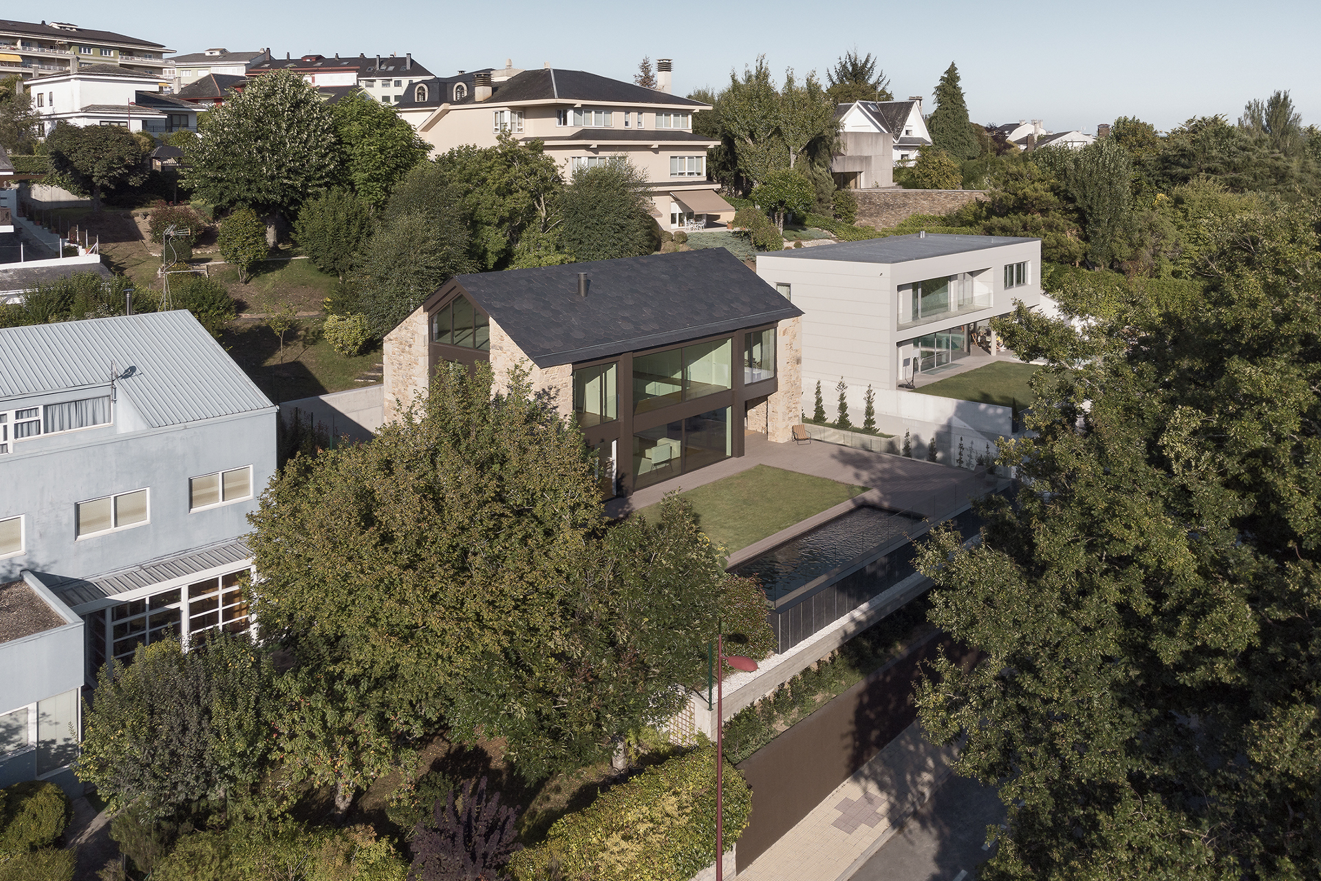 El juego visual exterior-interior, con interesantes combinaciones de materiales, así como la composición arquitectónica del conjunto, logran que este trabajo roce la tradición y la modernidad a partes iguales. La piscina de pizarra negra, que preside el jardín delantero, pretende imitar el fondo oscuro del río Miño que pasa a los pies de la misma.
