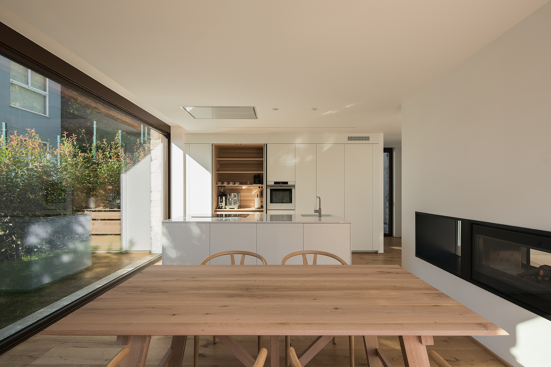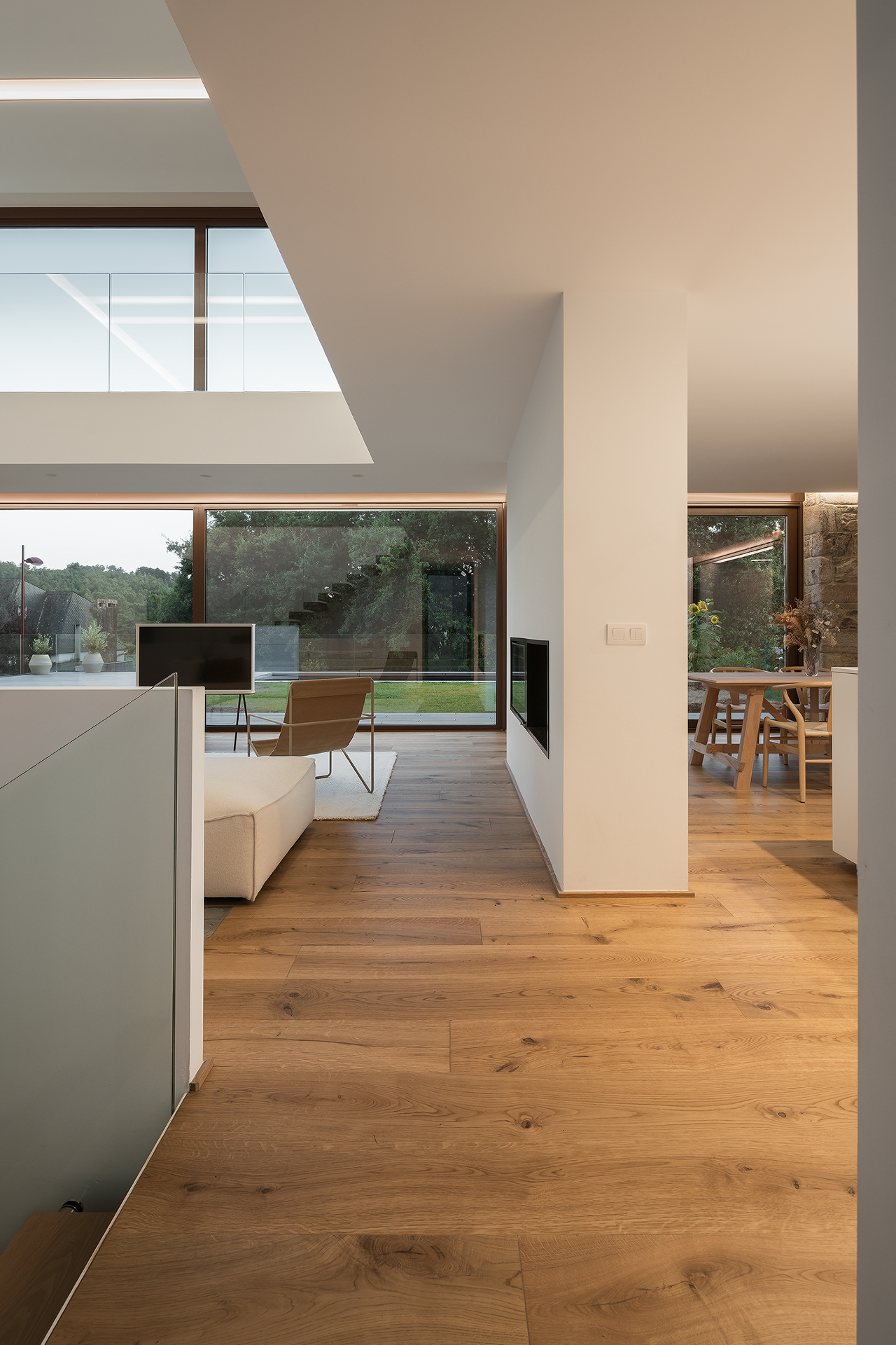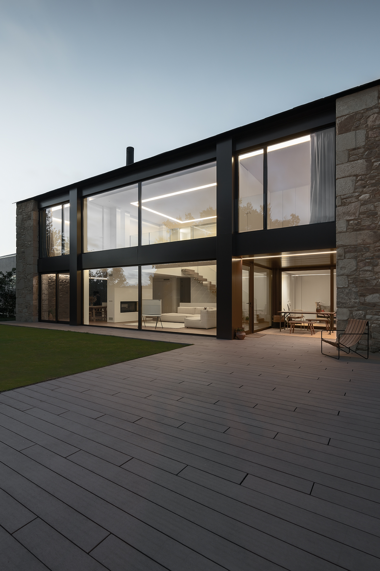 Con el río Miño al frente, esta vivienda de obra nueva en la capital Lucense, se alza como un oasis en la ciudad. Las líneas sencillas y rectas, la cubierta a dos aguas y la elección de materiales, nos evocan al pasado de la construcción típica gallega, pudiendo recordar a un gran hórreo moderno.Los espacios, tremendamente abiertos e interconectados, permiten la entrada de luz a todas las estancias de esta casa y bañar todos sus rincones. El estudio ha optado por tonalidades claras y naturales para dotar a esta vivienda de mayor serenidad, relax y paz. El interior es un amplio recorrido visual sin obstáculos. Los grandes espacios, la doble altura del salón y elementos permeables hacen que la casa juegue con el invitado y disfrute de sus increíbles calidades.